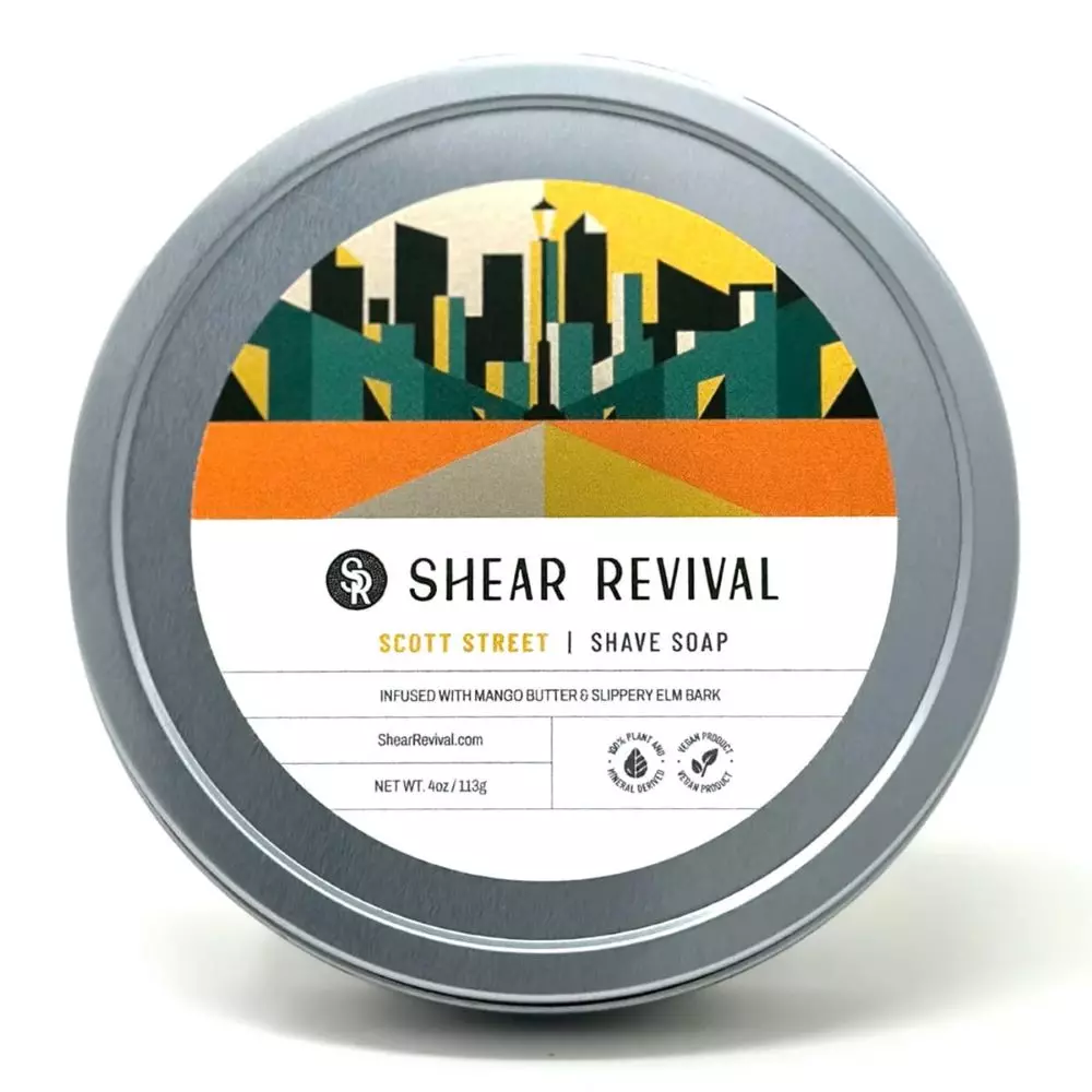 Mýdlo na holení Scott Street Orange & Oakmoss - Shear Revival se vyznačuje přírodní vůní pomeranče, dubového mechu a levandule, která osvěžuje a povzbuzuje smysly během holení. Produkt dobře pění, umožňuje precizní a pohodlné holení a nezanechává mastný film. Veganská receptura vytvořená z přírodních složek poskytuje nejen vynikající péči, ale také zajišťuje bezpečné použití. Díky použití rostlinných extraktů, jako je spirulina, extrakt z lékořice a éterický olej z kořenů vetiverie, mýdlo působí zklidňujícím dojmem a vyživuje a regeneruje pokožku po každém holení.