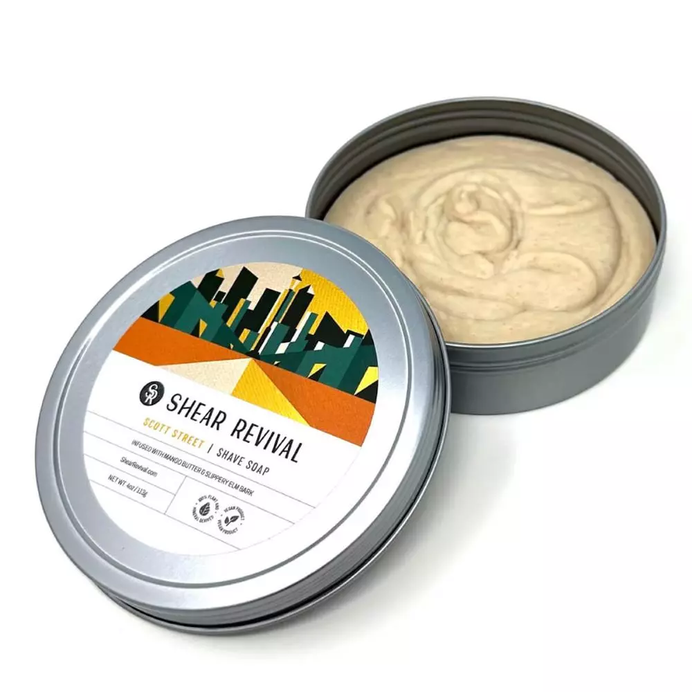 Mýdlo na holení Scott Street Orange & Oakmoss - Shear Revival je výjimečný produkt, který kombinuje vysoce kvalitní přírodní složky pro hladké a pohodlné holení. Vytvořeno ve spolupráci s Dr. Jon's Handcrafted Shave Soap Co., toto mýdlo hluboce hydratuje pokožku a zabraňuje jejím podrážděním. Díky bohaté receptuře s aloe, bambuckým máslem, ricinovým olejem, mangovým máslem a dalšími rostlinnými oleji účinně změkčuje vousy i pokožku, zanechává je měkké a hydratované. Produkt působí zklidňujícím a osvěžujícím dojmem, zabraňuje zarůstání vousů, což ho činí ideální volbou i pro velmi citlivou pokožku.