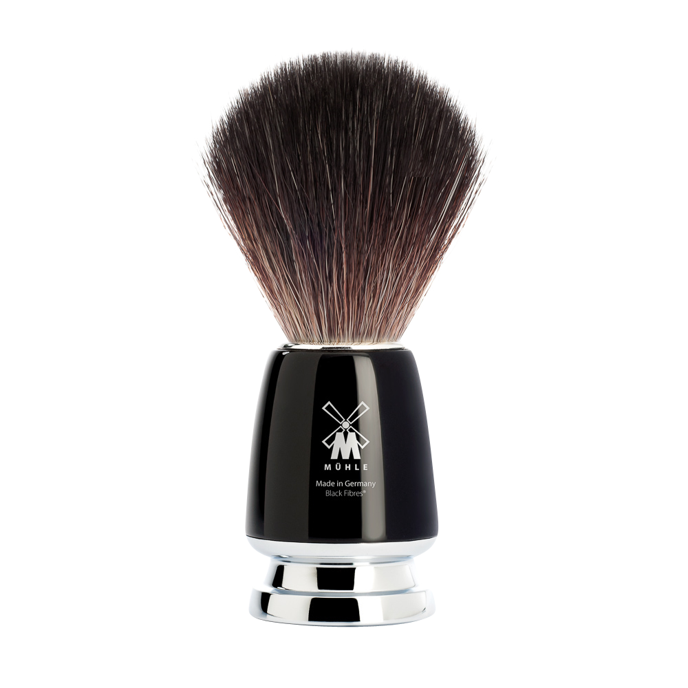Holící štětec 21 M 226 RYTMO - Mühle má elegantní rukojeť z černé syntetické pryskyřice, která je individuálně leštěná pro estetický efekt a trvanlivost. Ozdoby štětce jsou chromované a celkově má velkou odolnost vůči korozi, což je velmi důležité vzhledem k častému kontaktu s vodou během používání. Vzhled štětce zakončuje stylové logo této známé německé značky.