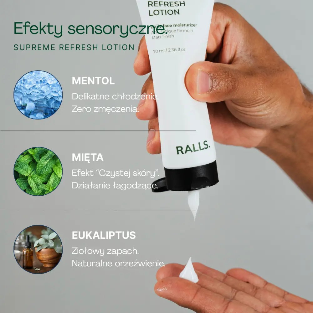 Krém na obličej Supreme Refresh Lotion - Ralls. neobsahuje parabeny ani složky živočišného původu, ale obsahuje osvěžující mátové a eukalyptové oleje. Hygienická a praktická tuba s minimalistickým vzhledem usnadní používání, a osvěžující hydratace vám dodá pozitivní energii každý den. Kromě toho aloe vera šťáva pečuje o správnou úroveň hydratace, takže se sahněte po kosmetickém přípravku od mladé polské značky Ralls. každé ráno.