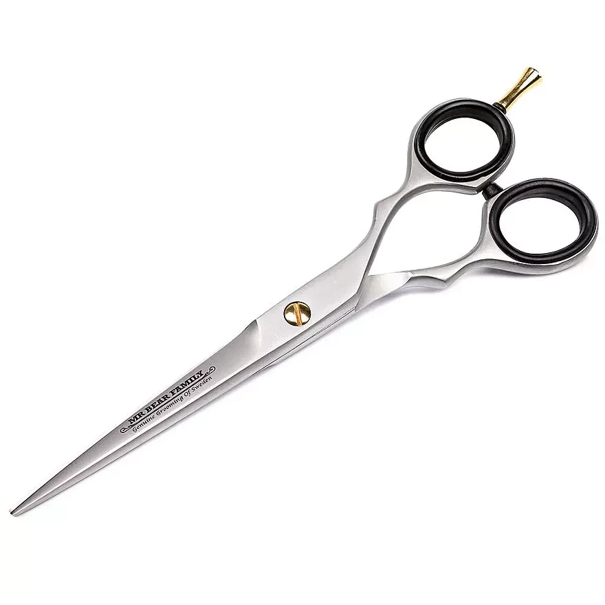 Čepel premium barber nůžek - Mr Bear Family je zdobena elegantním vyrytým logem této švédské značky a malým zlatým finger rest. Rovný, klasický tvar 6'' nůžek skvěle padne do ruky a je vhodný pro jakoukoli situaci. Celý produkt je balen v elegantní krabici, která je také ideální jako dárek.